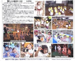 地域新聞“おはこんにちは”に掲載されました 2025年9月27日 reihougakuen 琉球新報の 読者がつくる地域新聞 “おはこんにちは”9月号に、年長クラスの夏休み前の楽しいプログラム『わくわくデー』の様子が掲載されました。 読者がつくる地域新聞